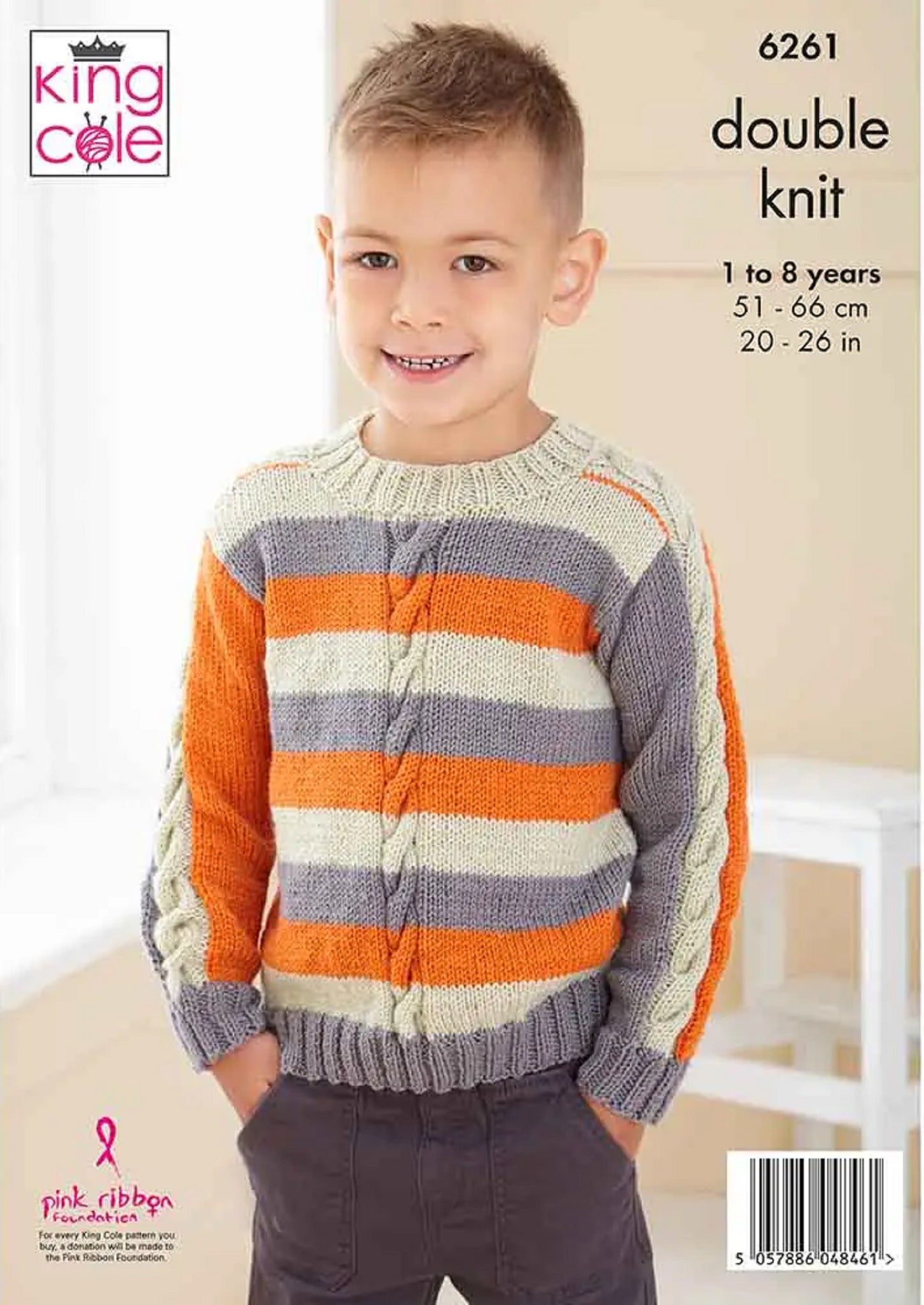 This double knit knitting pattern leaflet 6261 by King Cole will instruct you on how to create a boys cable knit detail sweater.