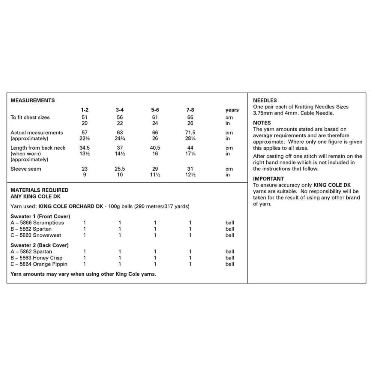 Details: This is a King Cole knitting pattern that instructs you on how to create boys sweaters with cabled detail, using Orchard DK yarn.