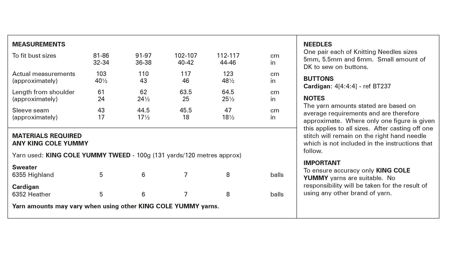 • Details: This is a King Cole knitting pattern that instructs you how to knit a ladies soft sweater & cardigan, using Yummy Tweed yarn.
