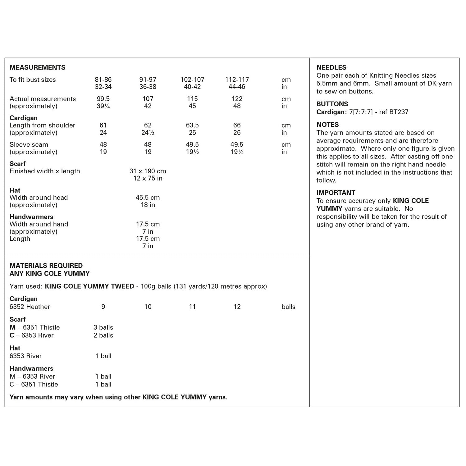 • Details: This is a King Cole knitting pattern that instructs you how to knit a ladies soft cardigan, scarf, hat and hand warmers, using Yummy Tweed yarn.