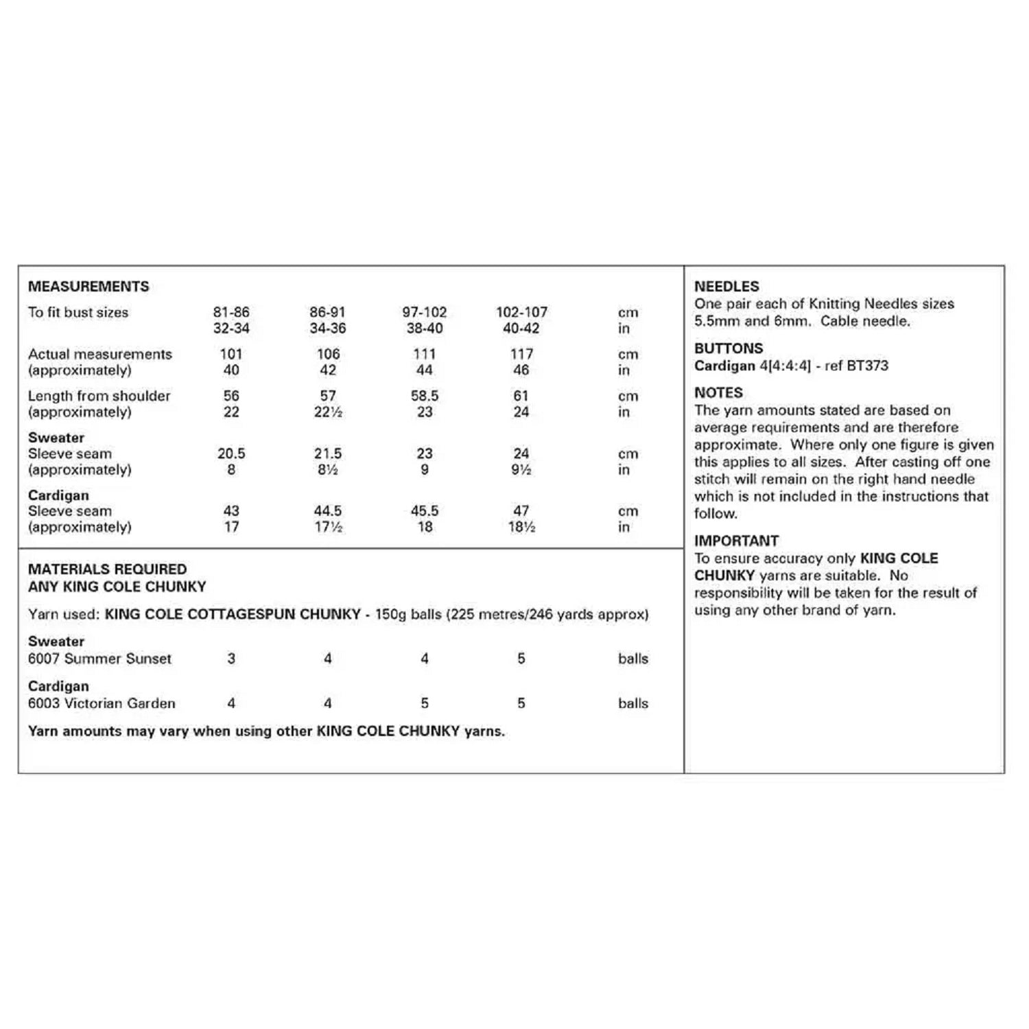 This chunky knitting pattern leaflet 6247 by King Cole will instruct you on how to create a lady's sweater and cardigan.