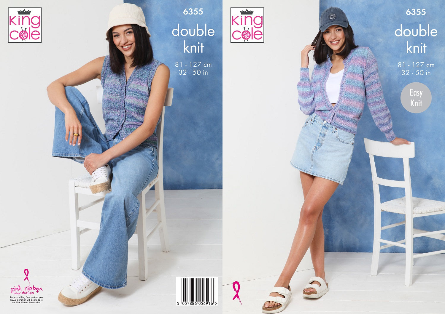 This double knit knitting pattern leaflet 6355 by King Cole will instruct you on how to create an easy knit, ladies cardigan & waistcoat.