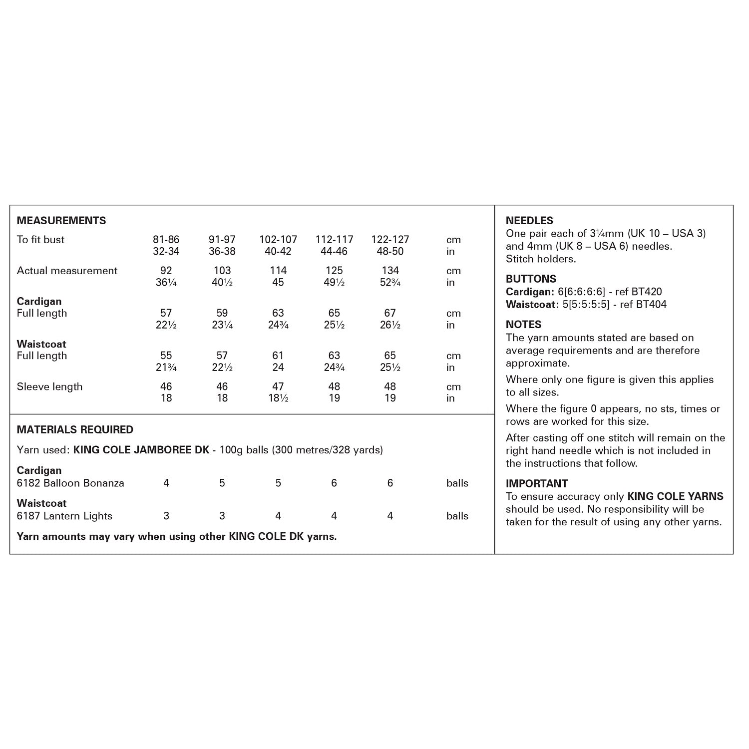 Details: This is a King Cole knitting pattern that instructs you how to knit a Ladies Cardigan & Waistcoat, using Jamboree DK yarn.