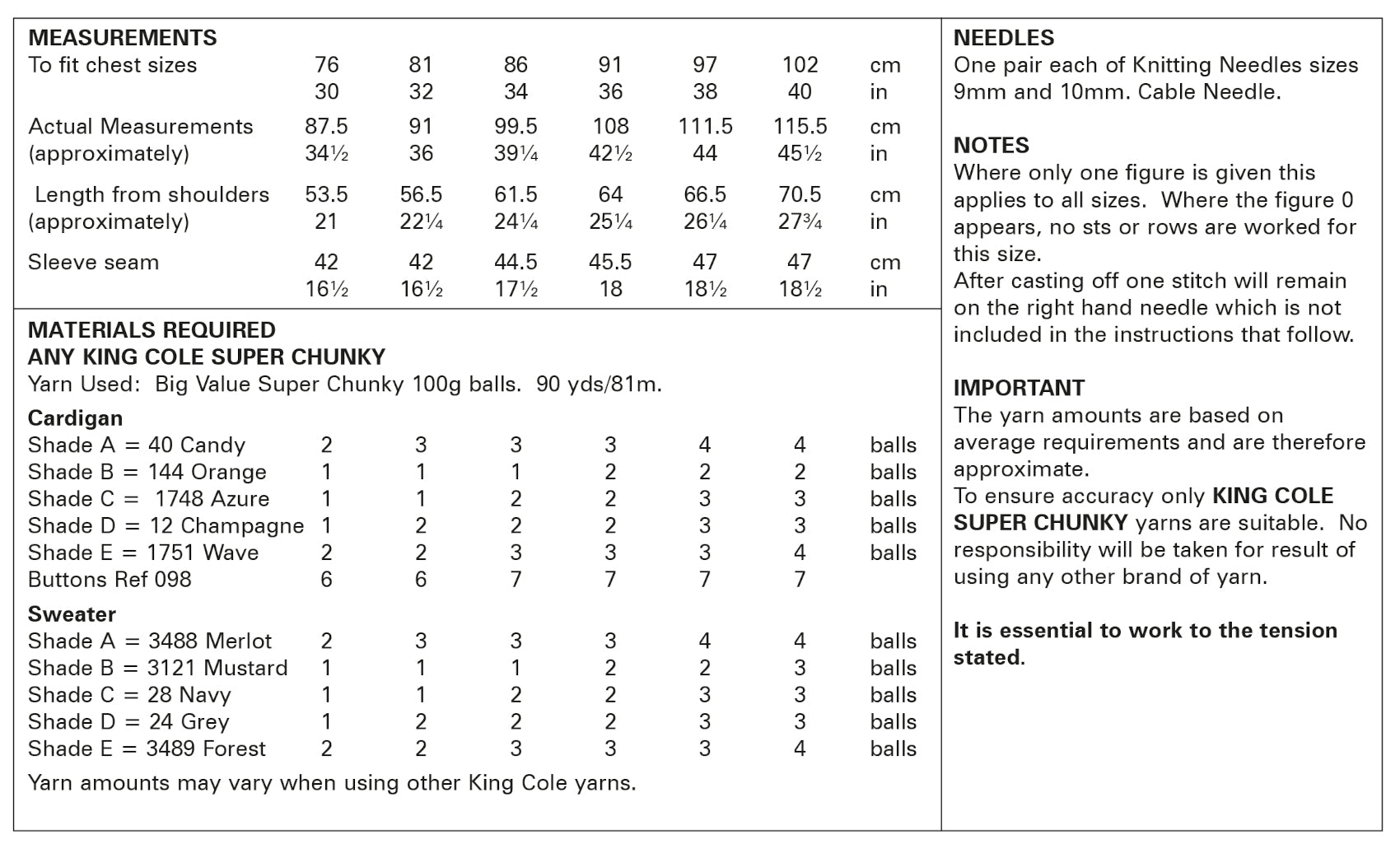 This King Cole knitting pattern is suitable for use with most super chunky yarns, however tensions may vary and we recommend you knit a tension square before knitting the whole garment.