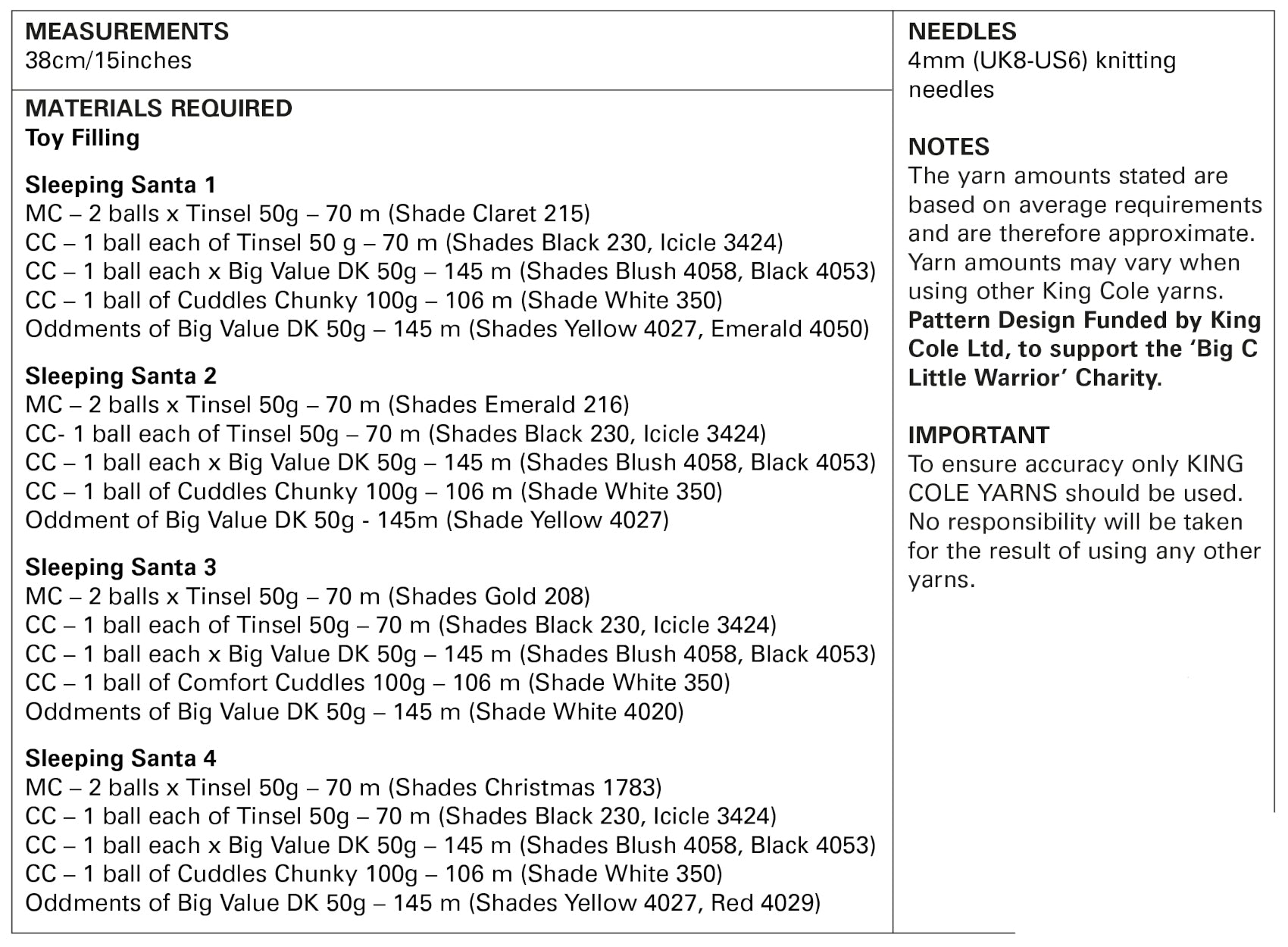 - Details: This is a King Cole knitting pattern that instructs you on how to knit a 'Sleeping Santa' to decorate the house during Christmas time, using Tinsel Chunky, Cuddles Chunky and Big Value DK yarn.