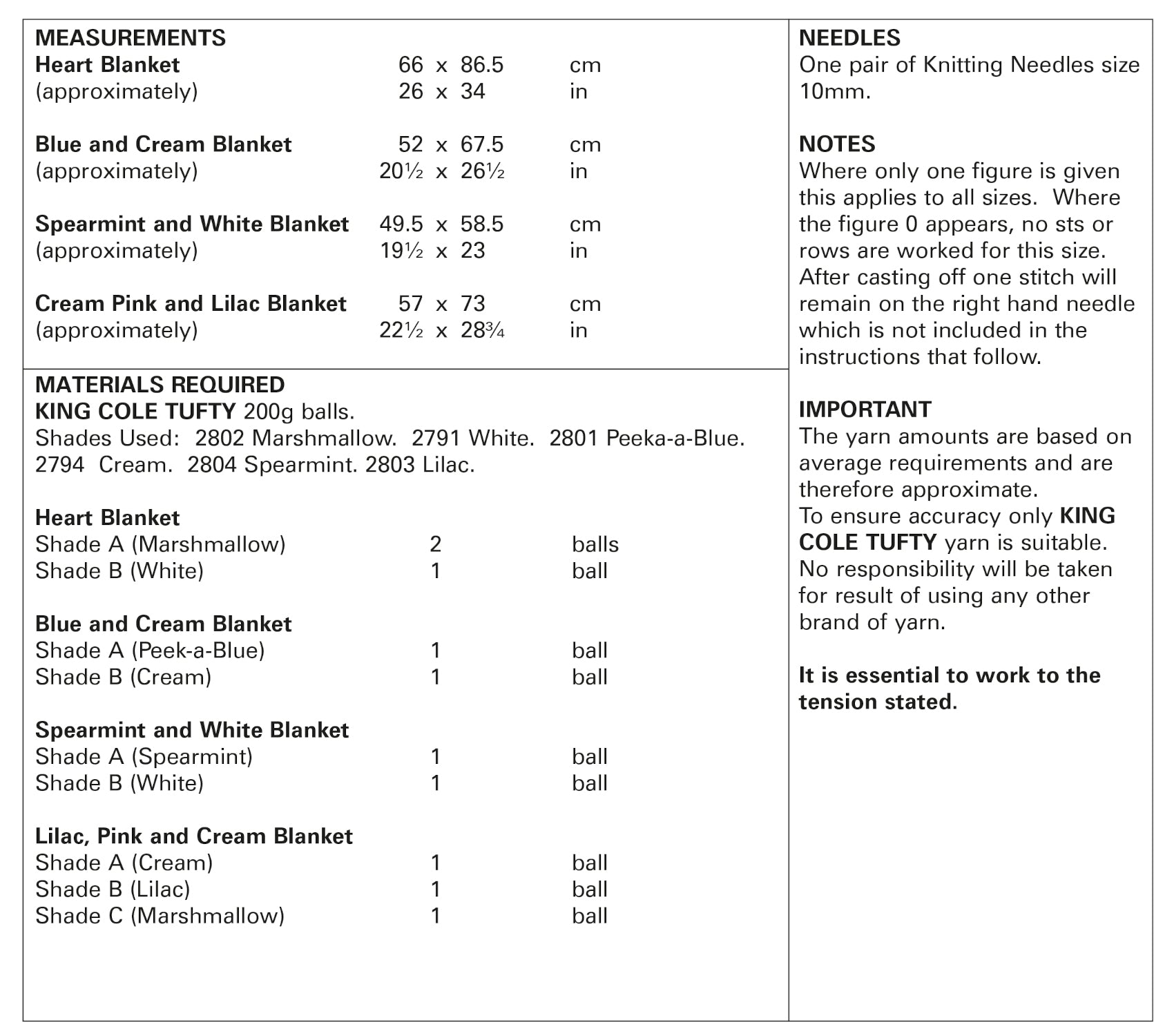 - Details: This is a King Cole knitting pattern that instructs you on how to knit fluffy baby blankets in a plain, striped or heart design, using Tufty yarn.