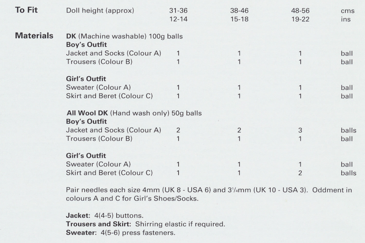 The pattern gives you measurements to create the garments to fit a doll height of 12" - 22" (31cm - 56cm).