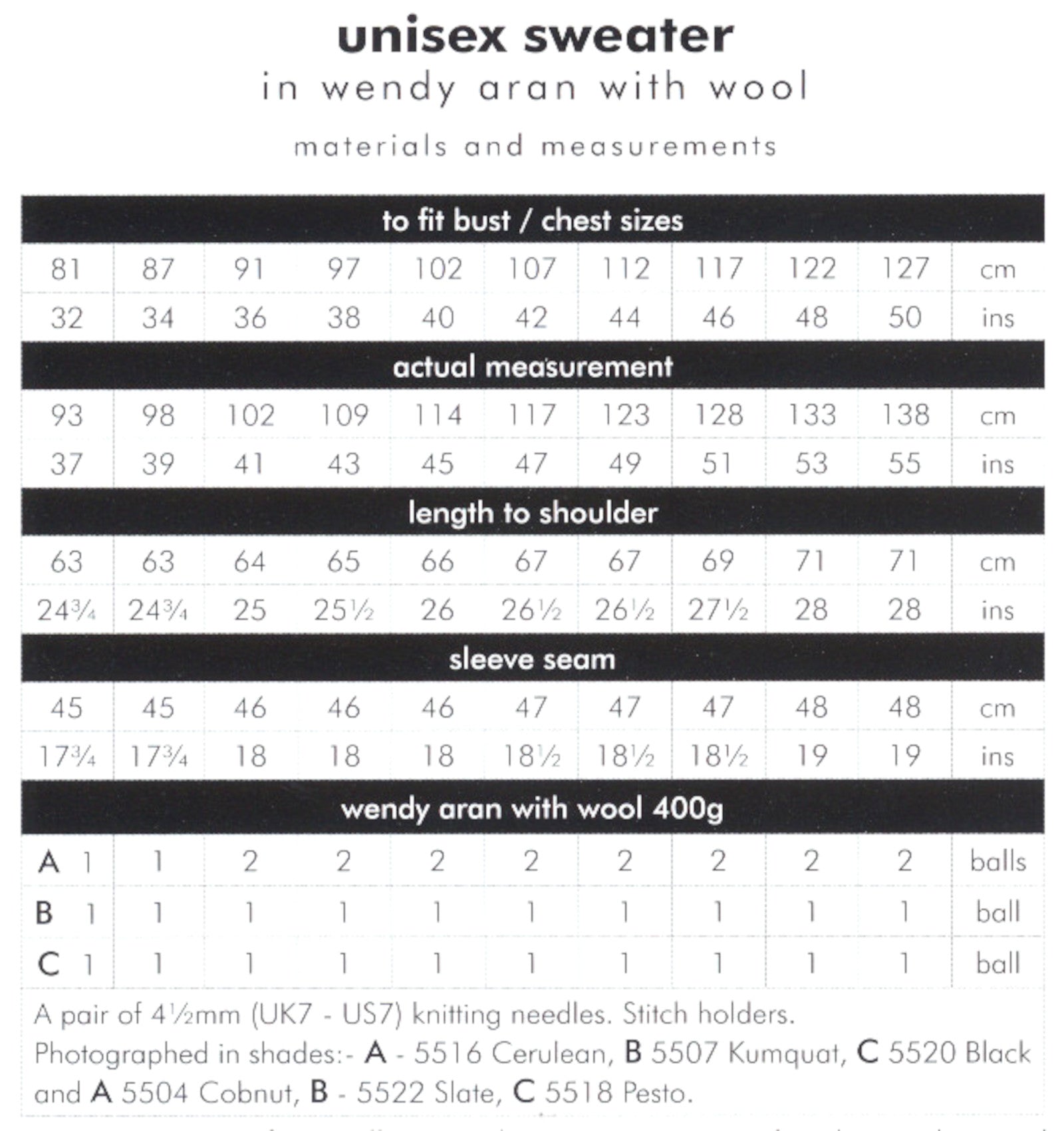 This knitting pattern is suitable for use with most aran yarns however, tensions may vary and we recommend you knit a tension square before knitting the whole garment.