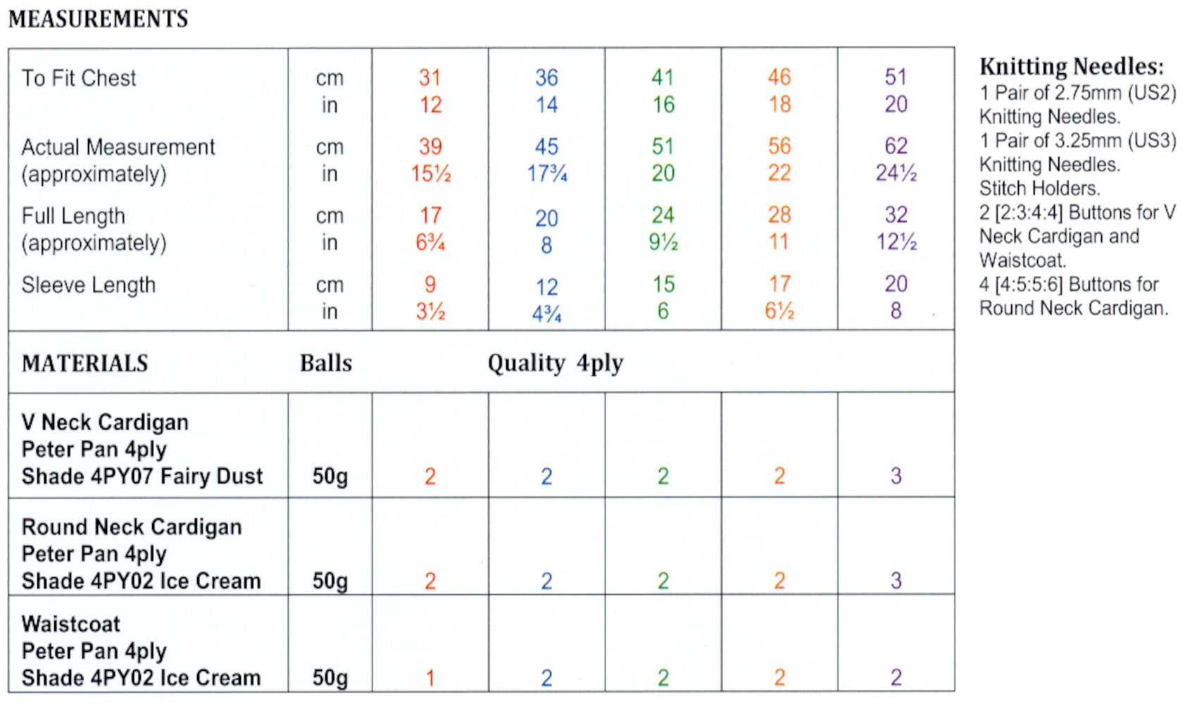 • Details: This Wendy baby 4ply knitting pattern instructs you how to knit a round or v neck cardigan and a waistcoat, using Peter Pan 4ply yarn.