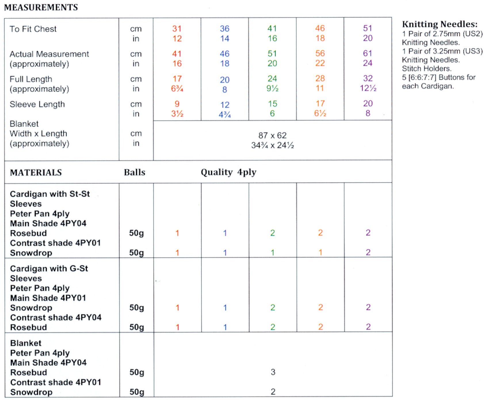 • Details: This Wendy baby 4ply knitting pattern instructs you how to knit a cardigan with stocking stitch or garter stitch sleeves and a blanket, using Peter Pan 4ply yarn.