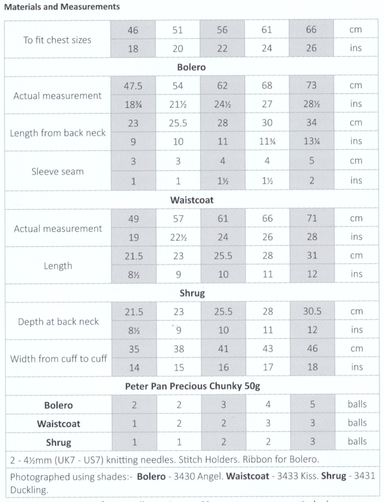 • Details: This Wendy baby chunky knitting pattern instructs you how to knit a bolero, waistcoat and shrug, using Peter Pan Precious Chunky yarn.