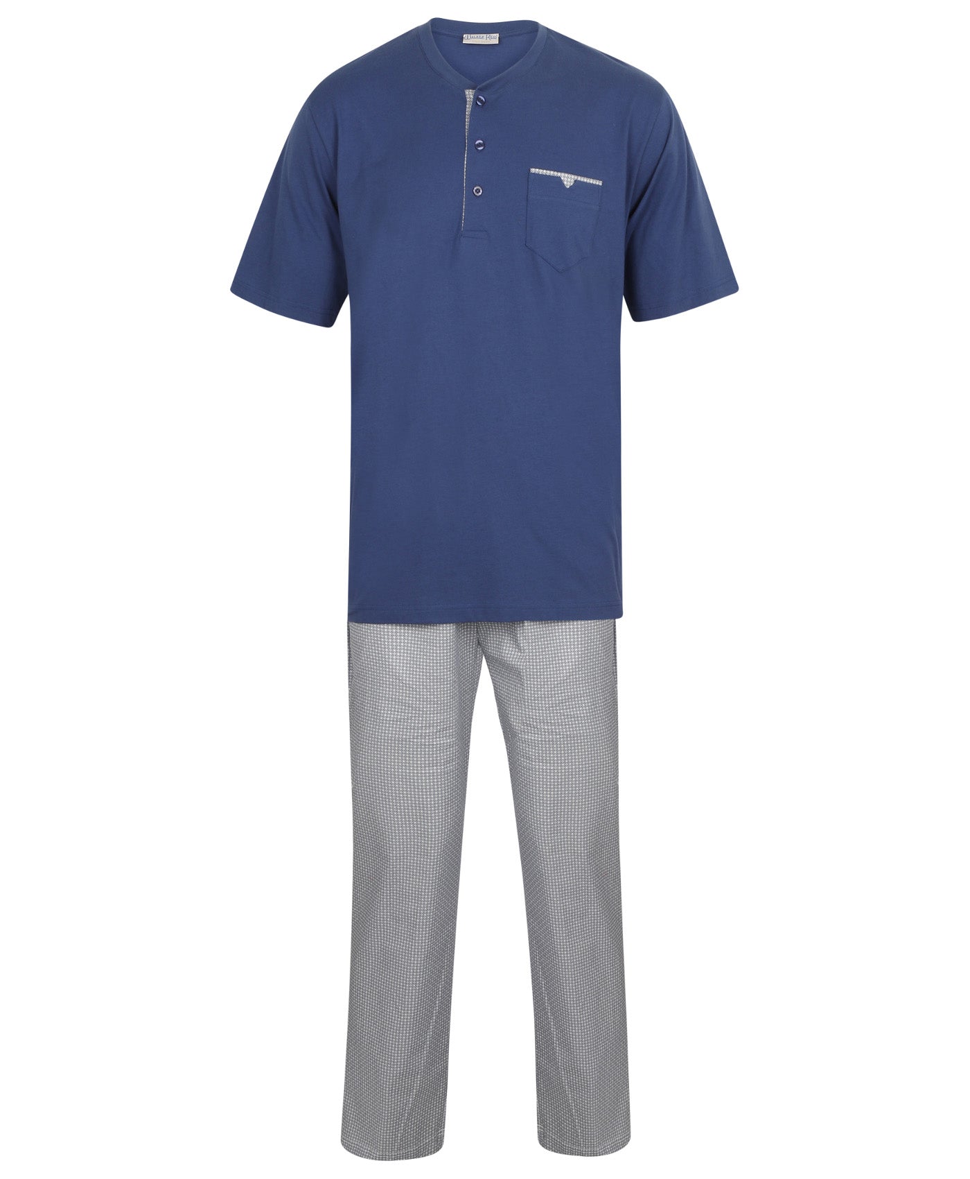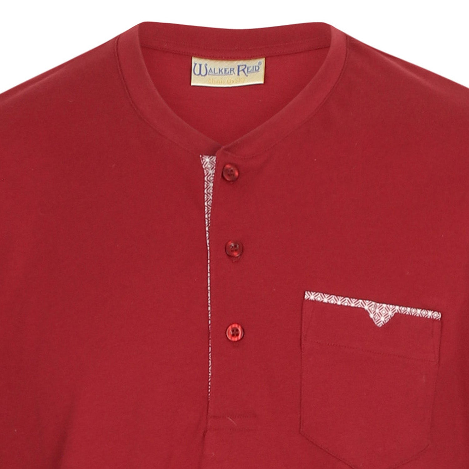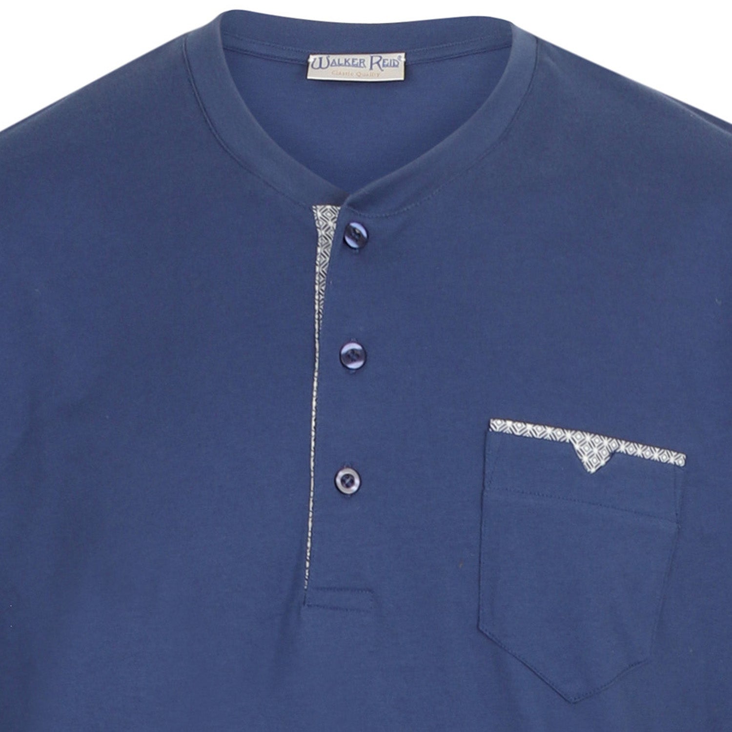 These men's pyjama sets by Walker Reid include a short sleeved plain jersey top with a chest pocket and a pair of full length geo print trouser bottoms with an elasticated waist.