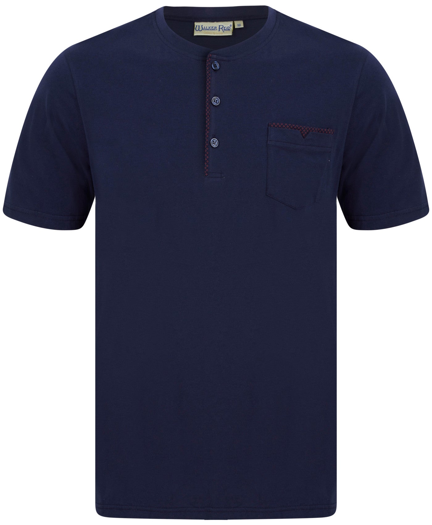 These men's pyjama sets by Walker Reid include a short sleeved plain jersey top with a chest pocket and a pair of full length diamond print trouser bottoms with an elasticated waist.