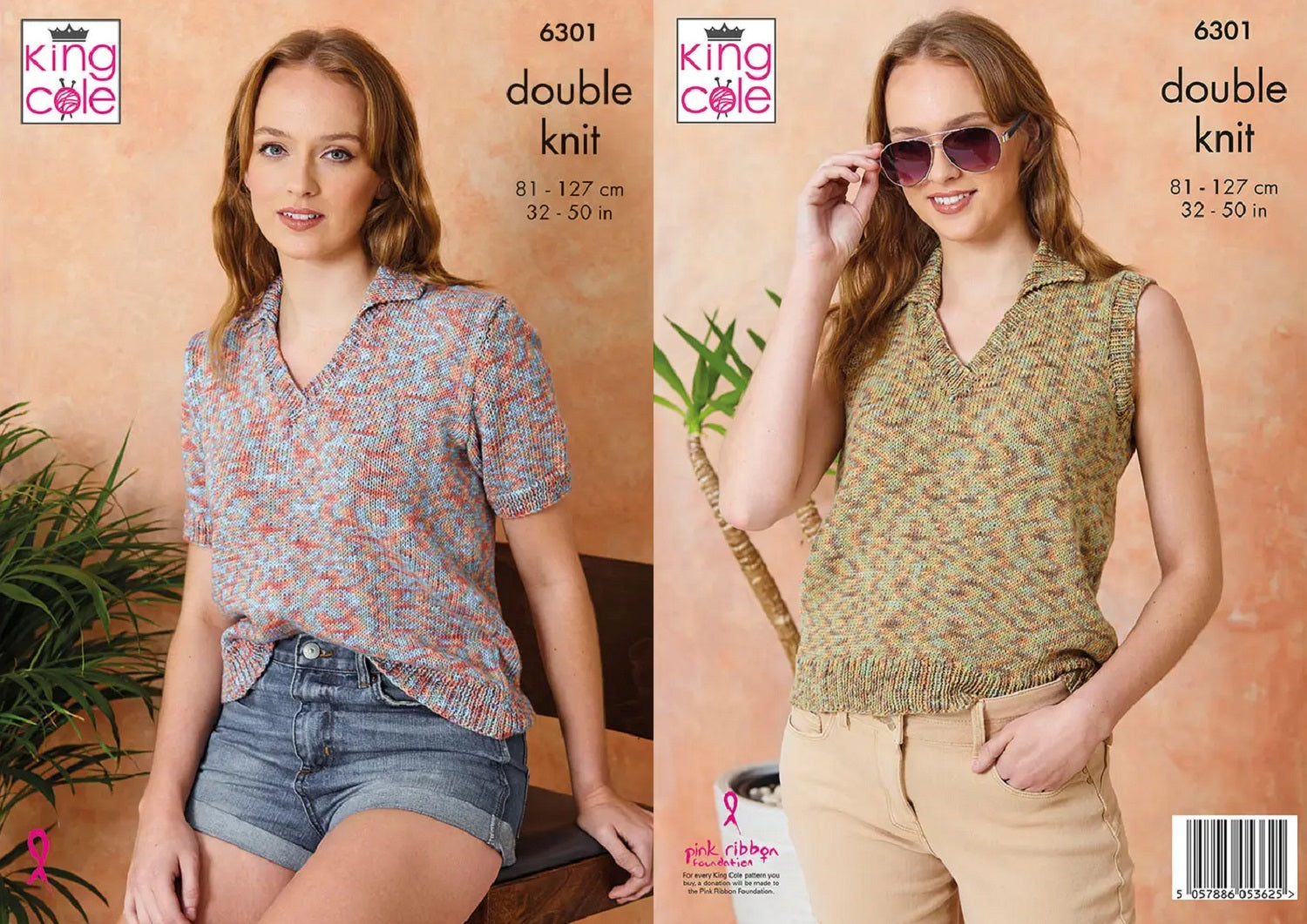 This double knit knitting pattern leaflet 6301 by King Cole will instruct you on how to create a ladies short sleeve or sleeveless top.