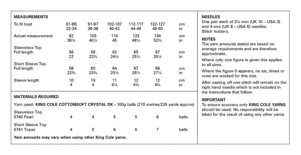 Details: This is a King Cole knitting pattern that instructs you how to knit a ladies sleeveless or short sleeve top, using Cottonsoft Crystal DK yarn.