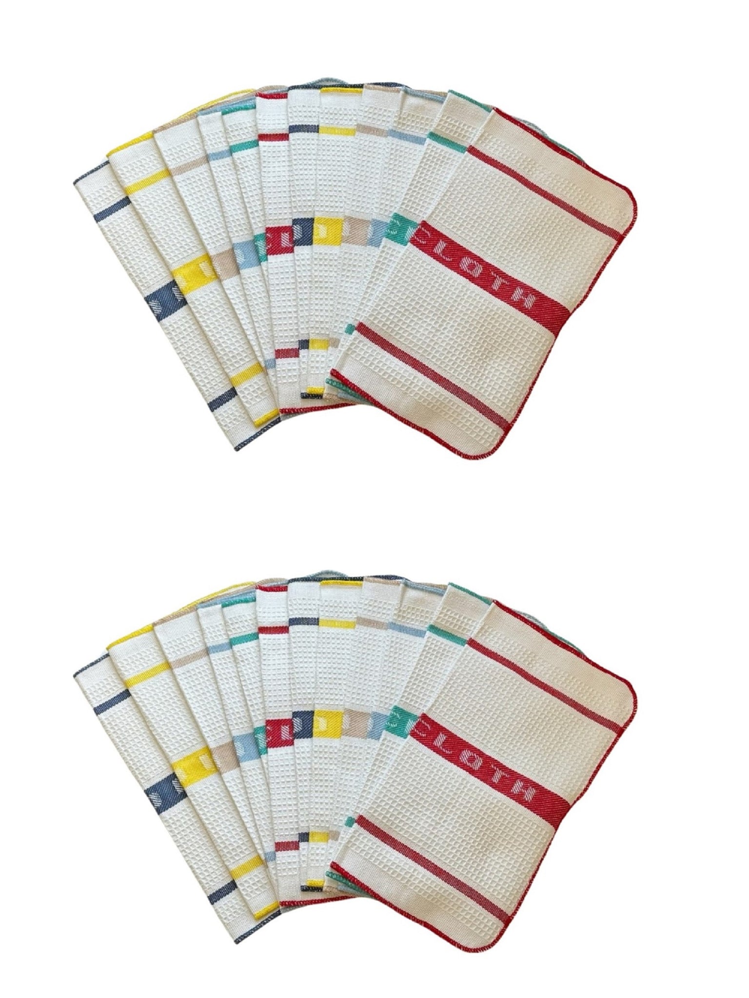 Available in a multi pack of 12, 24 or 48, each pack comes with a mix of Red & White. Green & White. Beige & White. Blue & White. Yellow & White. Navy & White dishcloths.