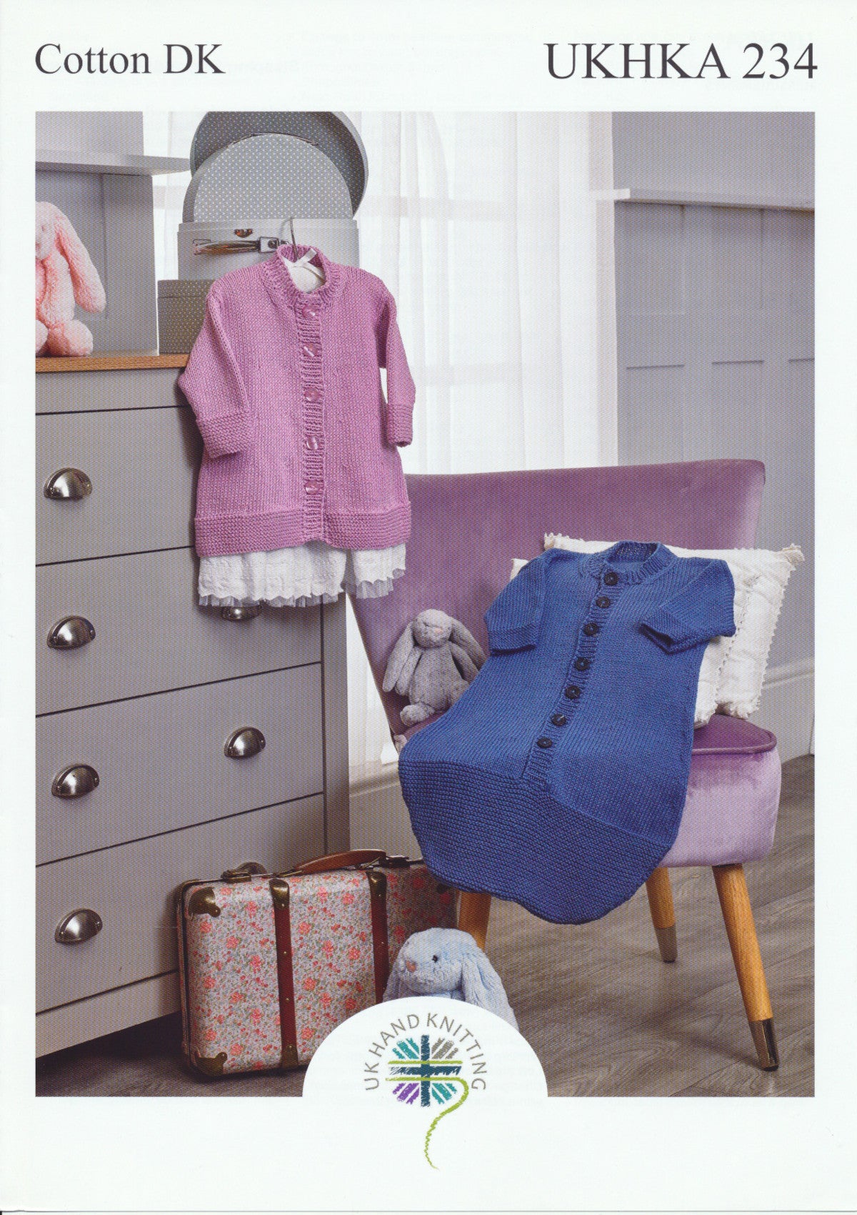 This baby double knitting pattern leaflet UKHKA 234 will instruct you on how to create a sleeping bag and a relaxed coat.
