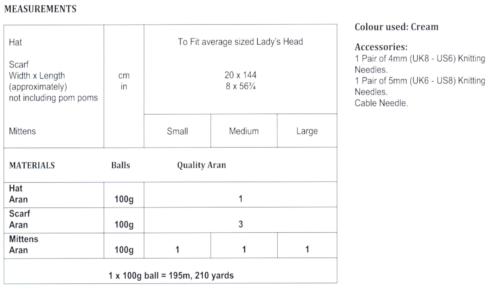 - Details: This is a UKHKA aran knitting pattern that instructs you how to knit a lady's cable knit hat, scarf and mittens.