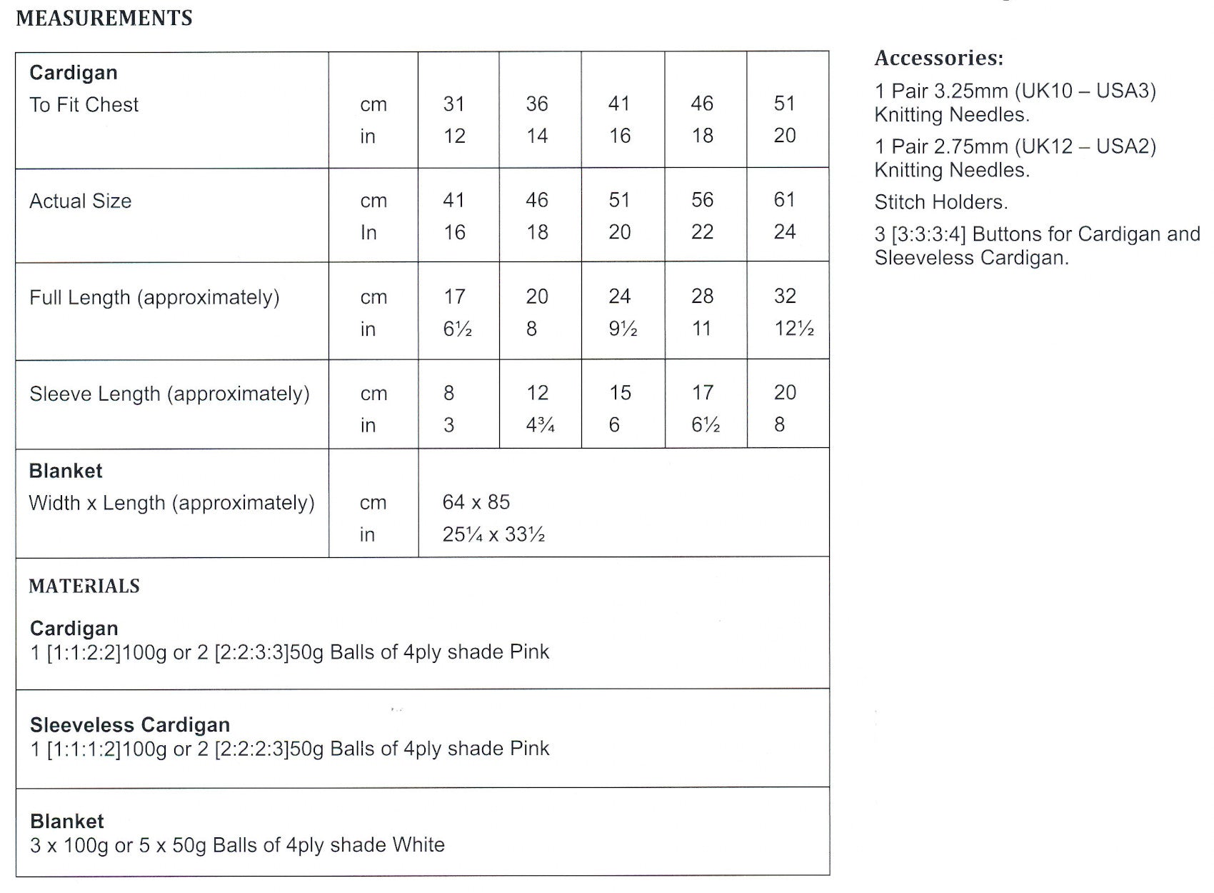 • Details: This is a UKHKA baby 4ply knitting pattern that instructs you how to knit a long sleeved or sleeveless cardigan and a blanket with lace detail.