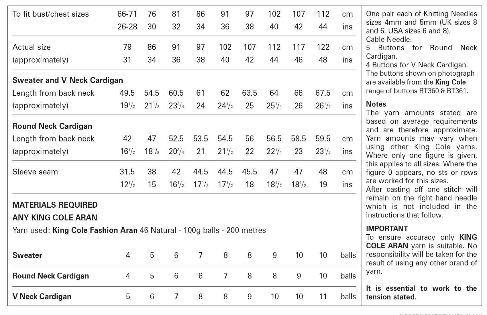 This King Cole knitting pattern is suitable for use with most aran yarns, however tensions may vary and we recommend you knit a tension square before knitting the whole garment.