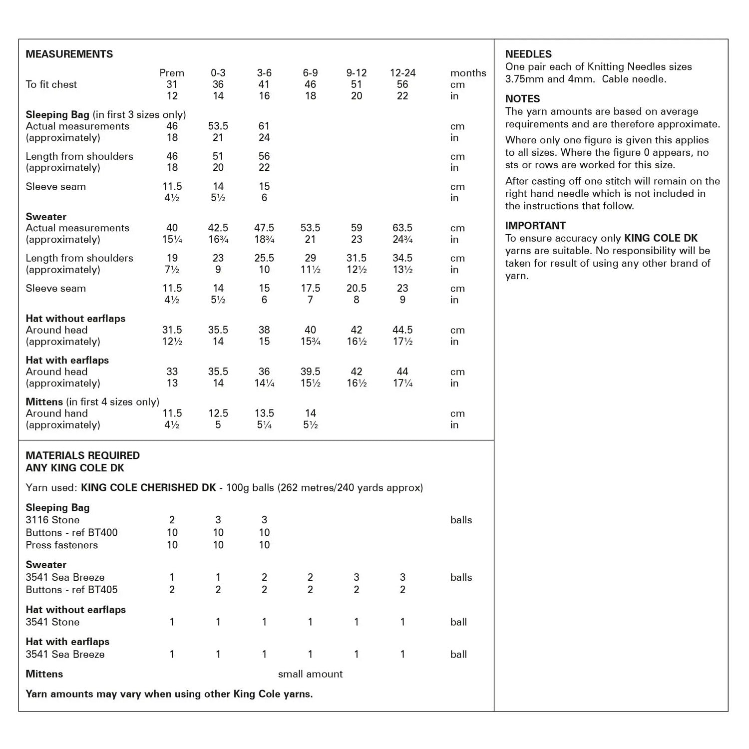 Details: This is a King Cole baby, double knit knitting pattern that instructs you on how to knit a babies Sweater, Sleeping Bag, Mittens & a Hat, using Cherished DK yarn.