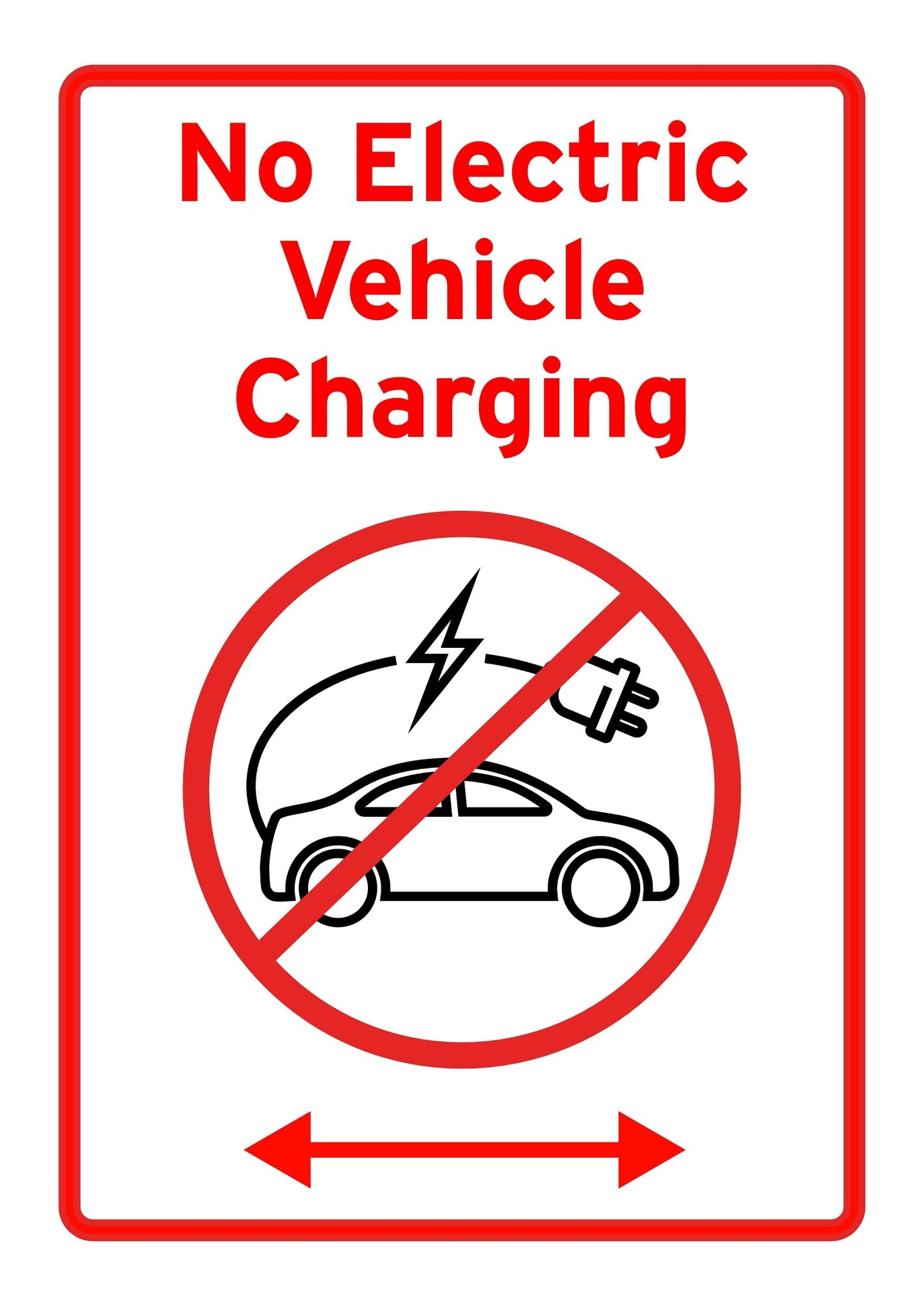Sign reads 'No Electric Vehicle Charging' with red writing on a white background.